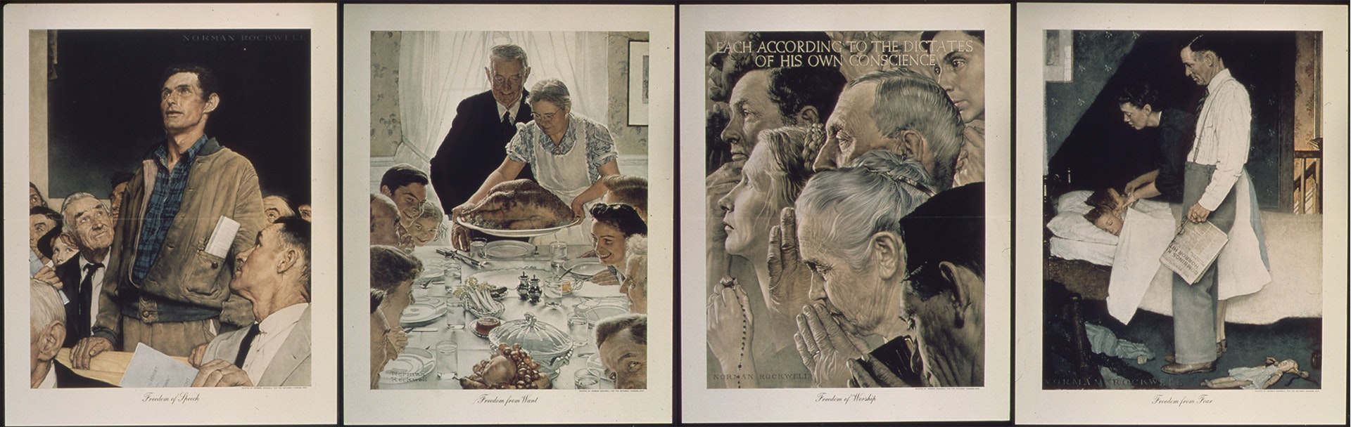 У січні 1941 року президент США Франклін Рузвельт виголосив історичну промову в рамках щорічного звернення до Конгресу. Він назвав чотири головні свободи, за які доведеться боротися всім демократичним силам світу: «свободу слова та вираження», «свободу кожного поклонятися Богу відповідно до своєї совісті», «свободу від страху» та «свободу від злиднів». Надихнувшись промовою президента, американський художник Норман Роквелл написав чотири картини, які ілюстрували кожну зі свобод.