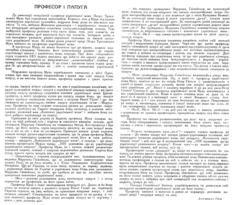 Після приходу до влади Сталіна політика коренізації поступово згорталась і була остаточно засуджена трагічного 1932 року. Але 1928 року жарти на цю тему ще були досить невинними. Тому у фейлетоні «Професор і папуга» автори висміюють занадто вимогливого професора, який вимагає від звичайного папуги говорити виключно державною українською мовою. В результаті папуга просто «паскудить» прямо на його вчену голову. Втім, сам фейлетон, як і весь журнал, надруковано українською.