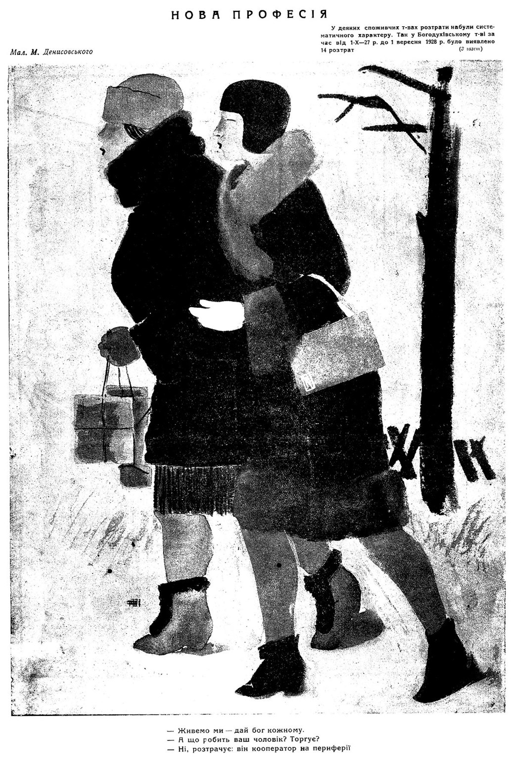 Проблема усіх часів — розтрати та корупція. Карикатура зображує двох добре одягнених жіночок, чоловік однієї з них «не торгує, а розтрачує», тобто присвоює кооперативні гроші.