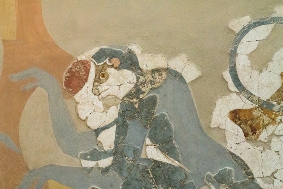 Раскопки Акротири начались в 1960-х годах. Благодаря вулканическому пеплу на стенах домов прекрасно сохранились фрески с разнообразными сценами из человеческой жизни, геометрическими фигурами, изображениями растений и животных, в том числе синих обезьян неустановленного вида. Уровень детализации говорил о том, что их рисовали люди, видевшие этих приматов вживую. Археологи предполагали, что обезьяны принадлежат к африканским видам, ведь сохранилось множество свидетельств торговых связей жителей острова с Египтом. Но недавно фрески осмотрела команда приматологов, которые и пришли к выводу: некоторые из обезьян явно родом из Индии.